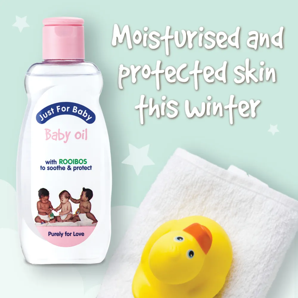 I-Just For Baby Baby Oil, ethakwe kahle ngeRooibos, igcina isikhumba simatile futhi kuqinisekisa ukuthi sihlala sithambile futhi sibushelelezi. Le fomula engasindi, futhi ayikwenzi uxhwathe amafutha kakhulu nokwenza ilungele ukusetshenziswa nsuku zonke, isiza ukuvimbela isikhumba esomile, esiklazukile esivame ukuhambisana nezinyanga ezibandayo.