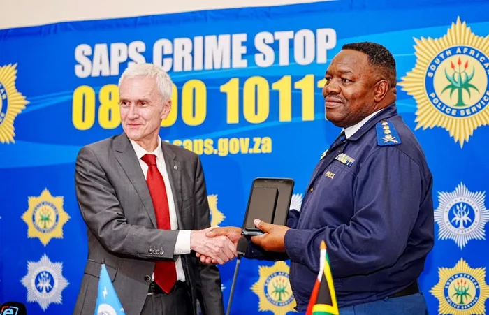 UNOBHALA we-Interpol uDkt Jurgen Stock enikeza uMkhuzi wamaPhoyisa kuleli, uGeneral Fannie Masemola umshini Isithombe: SITHUNYELWE