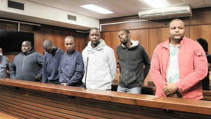 UMNUZ Mlungisi Thabethe (umufi, ogqoke ijakhethi e-pink), Mnuz Andile Nhleko, Mncedisi Mzobe, Mnuz Siyanda Msweli (owaphuma phambili), Lindani Ndlovu noMalusi Mthembu ngesikhathi besasolwa ngokuthumba nokubulala u-Andile “Bobo” Mbuthu Isithombe: DOCTOR NGGCOBO/INDEPENDENT MEDIA