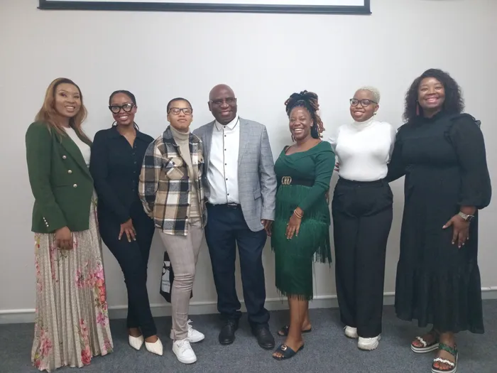 KUSUKELA kwesokunxele uSinini Mati, Minenhle Luthuli, Portia Ndudane, Ngqabutho Bhebhe, Nombuso Buthelezi, Lindokuhle Mthimkhulu noPinky Radebe; abebeyizikhulumi emcimbini wokucobela abesifazane ngolwazi lwezokulingisa Isithombe: SIMANGALISO NTSHANGASE