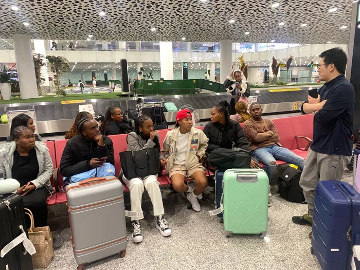 Ezinye zezitshudeni zaseDUT zisesikhumulweni sezindiza eShenzhen zilinde abanye ozakwabo zihaamba nenhloko yeDurban University Of Technology Confusius Institute uFrank Lin WU Isithombe: Fanelesibonge Bengu