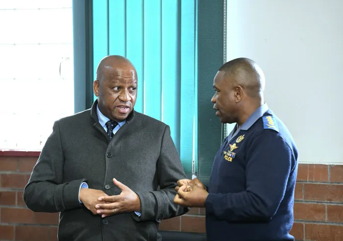 UNDUNANKULU waKwaZulu-Natal, uMnuz Thami Ntuli, nomkhuzi wamaphoyisa KwaZulu-Natal, uLieutenant General Nhlanhla Mkhwanazi, ngesikhathi kunembizo yokulwa nobugebengu ebiseMgungundlovu Isithombe: Gcina Ndwalane/ Ihhovisi likandunankulu waKwaZulu-Natal