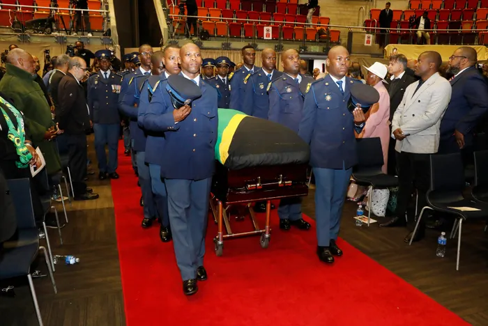 Amaphoyisa akwaSAPS efika nebhokisi yowayenguNgqongqoshe weZimali kuleli uMnuz Pravin Gordhan obengcwatshwa izolo Isithombe: DOCTOR NGCOBO/Independent Newspapers