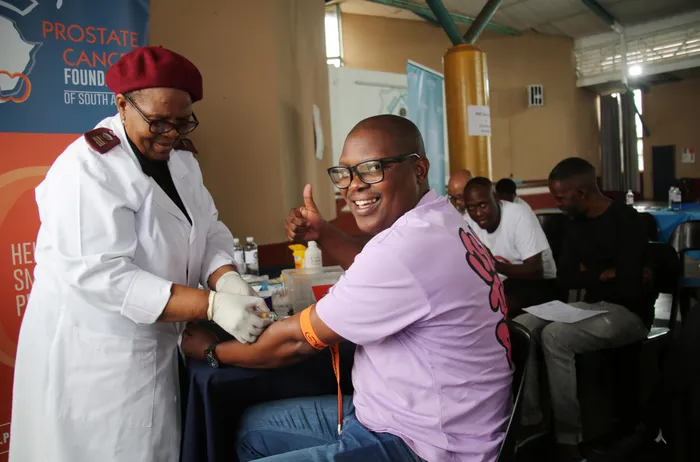 UMHLENGIKAZI uNondumiso Masoka ehlola uMnuz Kwazi Poto ngesikhathi kunomkhankaso wokugqugquzela amadoda ukuthi ahlolwe umdlavuza wamankwahla eMlazi Com-tech Isithombe: TUMI PAKKIES/ INDEPENDENT NEWSPAPERS