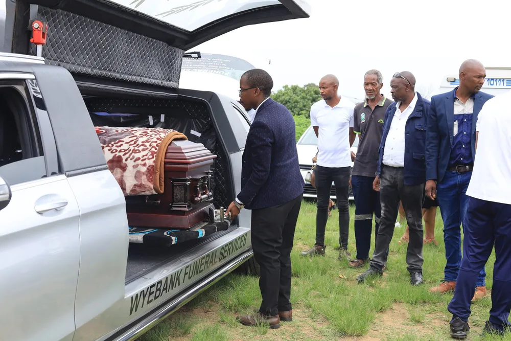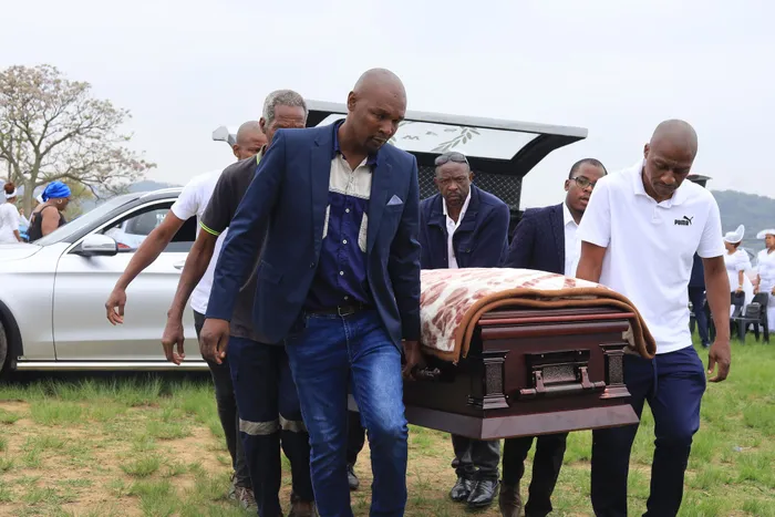 IZIHLOBO ziphethe ibhokisi elinomufi uMnuz Sifiso Zibane zilisusa emotweni yamakhaza i-Wyebank Funeral Services, ziyolibeka etendeni eSikhumbuzo Primary, lapho obekuqhubeka khona inkonzo yomngcwabo Isithombe: SIBONELO NGCOBO
