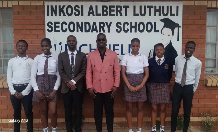 ABAFUNDI abenza umatric eNkosi Albert Luthuli Secondary nothishanhloko, uMnuz Njabulo Mhlongo (phakathi nendawo) nowayengumfundi kulesi sikole, uMnuz Mashaya Mthethwa Isithombe: NHLAKANIPHO MNQAYI