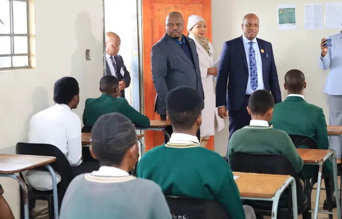 UNdunankulu wesifundazwe, uMnuz Thami Ntuli, noMphathiswa wezeMfundo esifundazweni, uMnuz Sipho Hlomuka, bahlole ukubhalwa kuka-matric esikoleni, Isolemamba High, eNsimbini, eFolweni, lapho befike abafundi belungiselela ukubhala.