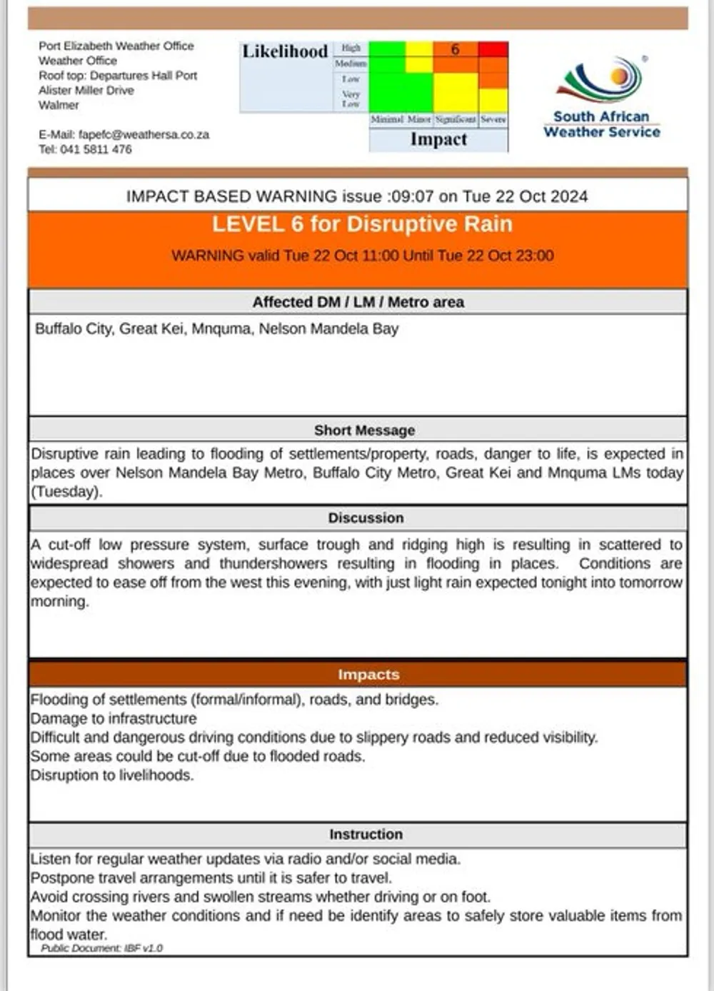 Umasipala iNelson Mandela Bay unxuse izakhamuzi ukuba ziphephe, zinikele emahholo uma isimo sisibi kakhulu njengoba izangoma zezulu zikhiphe esinye isexwayiso sesigaba 6.