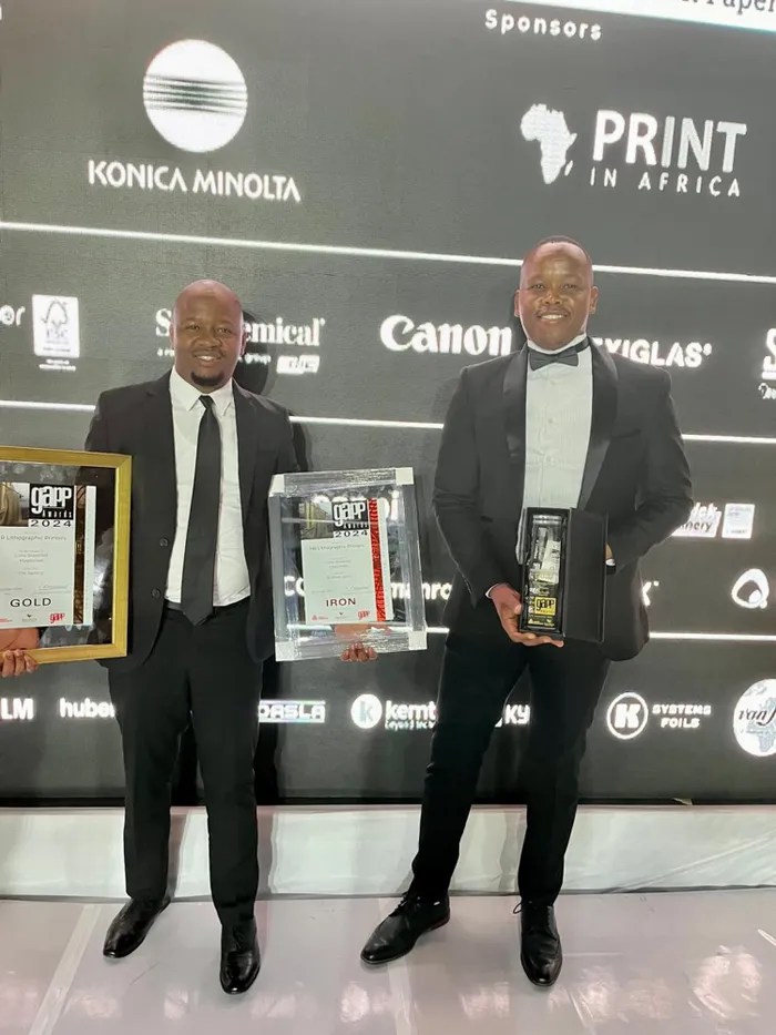 ABASEBENZI benkampani iProcess Litho oMnuz Ntobeko Sibiya noMelusi Hlabisa bephethe indondo abahlabane ngayo eSandton, lapho kuklonyeliswe izinkampani ezenze kahle emkhakheni wokugaya Isithombe:SITHUNYELWE
