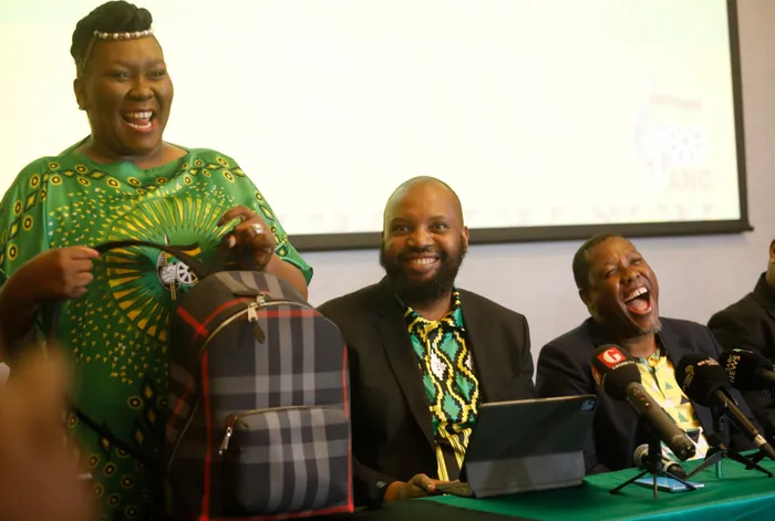 Iphini likaSihlalo we-ANC eKZN uNksz Nomagugu Simelane, uSihlalo we-ANC eKZN uMnuz Siboniso Duma kanye noNobhala we-ANC eKZN uMnuz Bheki Mtolo ngesikhathi i-ANC inesithangami sabesindaba Isithombe: DOCTOR NGCOBO/Independent Newspapers