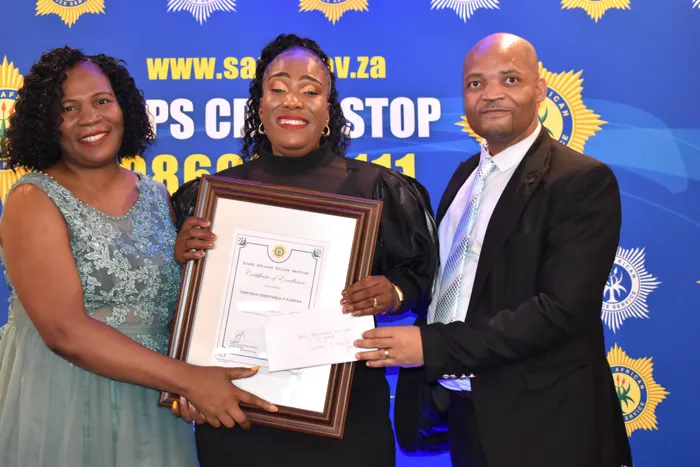 U-BRIGADIER Tsakani Mtileni (kwesokunxele), Constable Phyllis Kubeka noMnuz Mlungisi Khoza wakwa-Old Mutual Isithombe: SITHUNYELWE