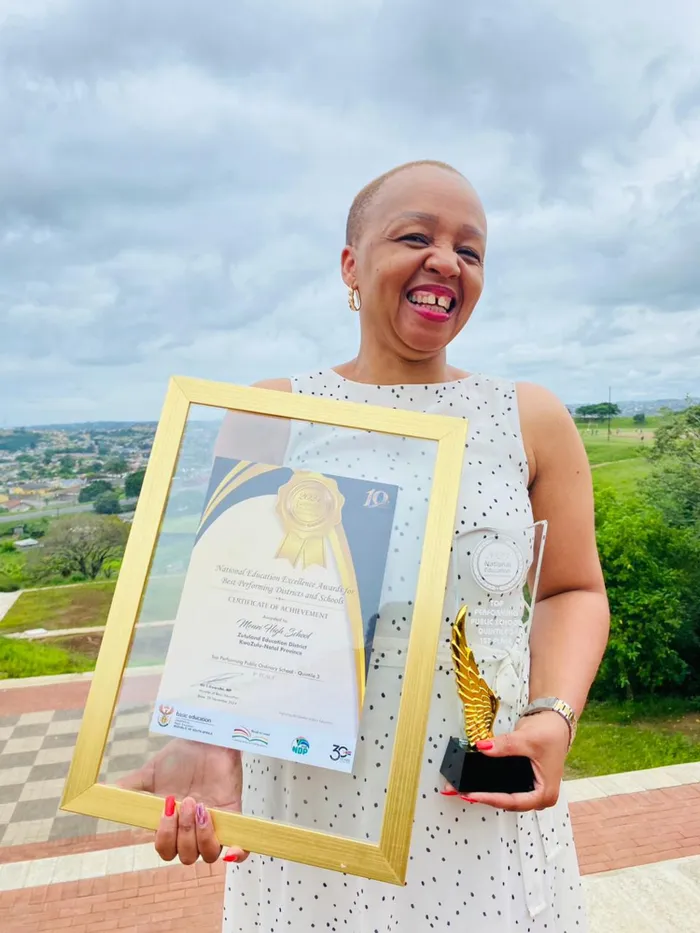 UTHISHANHLOKO waseMenzi High eMlaza, uNkk Nozipho Ndlanya, nendondo abuye nayo emcimbini obuhlelwe nguMnyango weMfundo eyisiSekelo, ngokuqwaqwada zonke izikole zakuleli ezingu-Quintile 3 ngokwenza kahle Isithombe:SITHUNYELWE