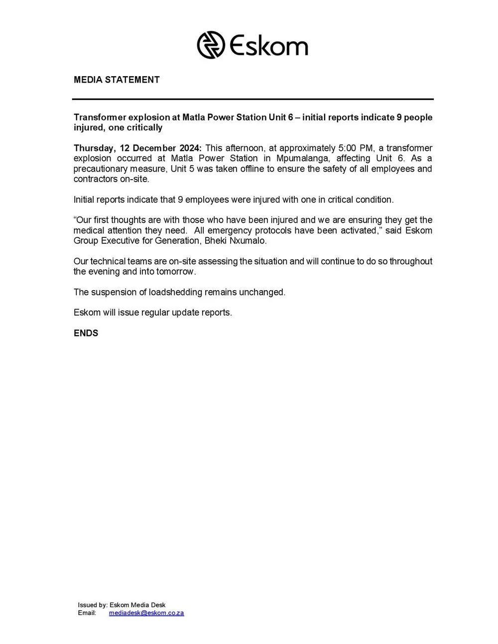 Oyi-Group Executive for Generation kwa-Eskom uMnuz Bheki Nxumalo uzwakalise ubuhlungu ngabasebenzi abalimele wabafisela ukululama okusheshayo.