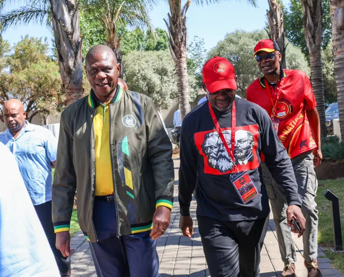 IPHINI likamengameli le-ANC nezwe uMnuz Paul Mashatile lamukelwa ngunobhala jikelele weSACP uMnuz Solly Mapaila, engqungqutheleni yale nhlangano eseGoli izolo Isithombe:X/PAUL MASHATILE