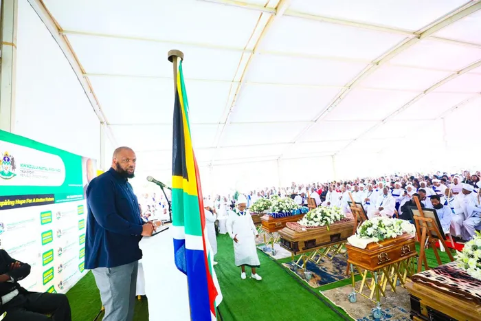 UMPHATHISWA wezokuThutha e-KZN, uMnuz Siboniso Duma ekhuluma eFolweni, eThekwini emngcwabeni wamalungu amahlanu akwaGumede ashone engozini yomgwaqo Isithombe: Sithunyelwe