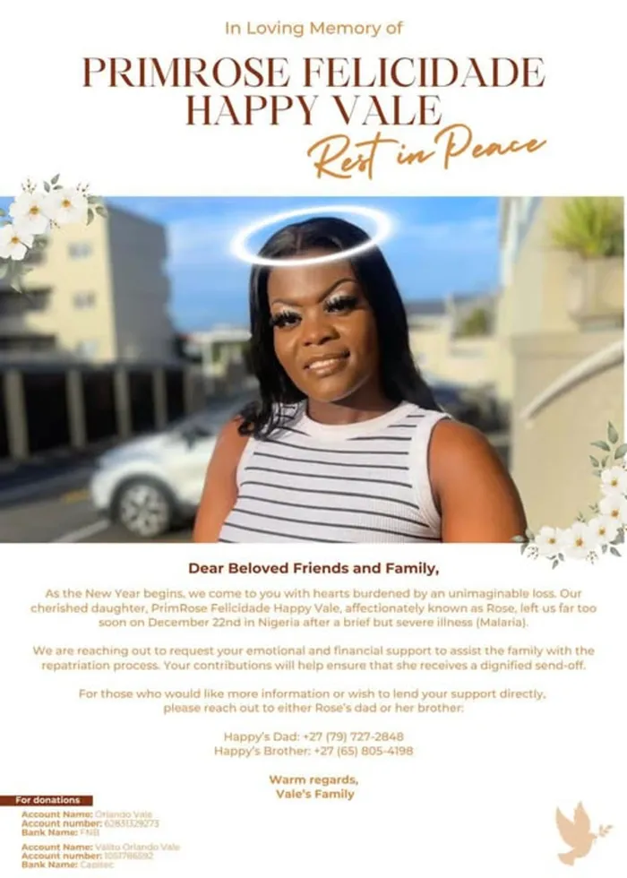 Umndeni wakwaVale eRamochana, ngaseRustenburg, ukhungathekile ngokudlula emhlabeni kwendodakazi yawo uPrimrose Happy Vale oshonele eNigeria, ngemuva kokuxinwa wumalaleveva.