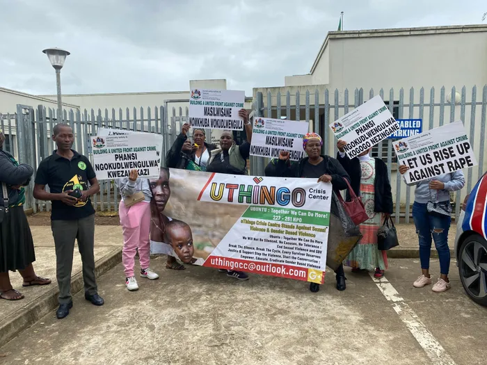 AMALUNGU e-MK nabenhlangano yamalungelo ezingane, uThingo Crisis Centre bezwakalisa ilaka labo ngaphandle kweNkantolo yeMantshi yaseMbumbulu Isithombe : ZIMBILI VILAKAZI