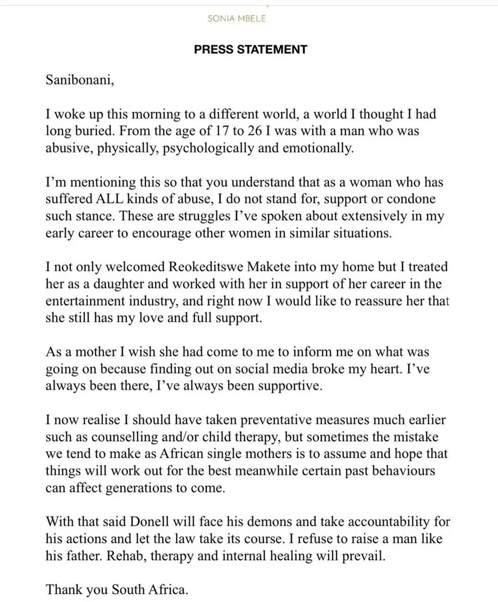 Esitatimendeni uSonia uyacacisa ukuthi intombi yendodana, wayamukela ngesihle ekhaya lakhe futhi eyisiza nangomsebenzi wayo kwezikaqedisizungu. Uthi kwaba buhlungu ukubona intombi isifake i-video ikhala ezinkundleni zokuxhumana ingakaze ikhulume naye ngezinkinga ebhekene nazo.