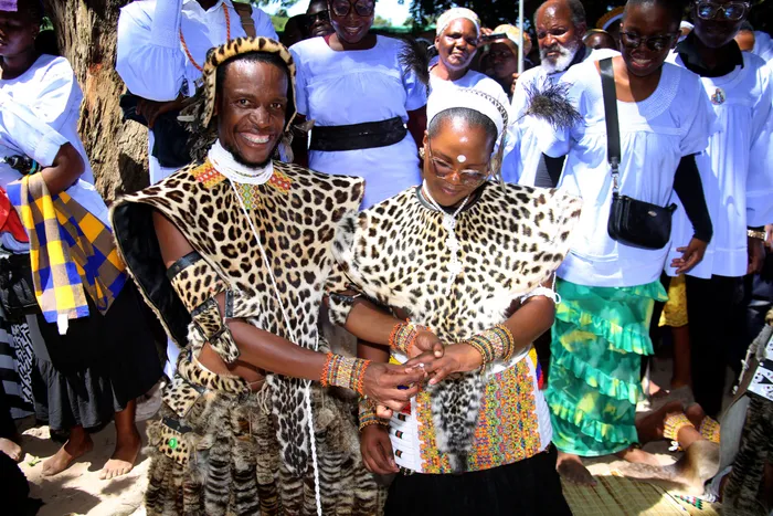 KUVUNGUZE umoya wenjabulo, kwaqhuma umkikizo, kukhala nezimbomu kuhlanganiswa inqwaba yemishado ebandleni lakwaShembe, eBuhleni, eNanda izolo. Abasesithombeni, uMnuz Musawenkosi Mthethwa nowakwakhe uMaNxuswa, abebekwabashadisiwe. Isithombe: Tumi Pakkies/ Independent Newspapers