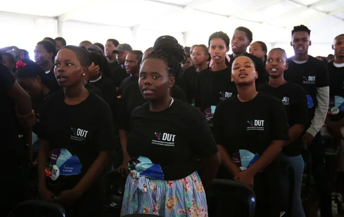 INJABULO ibibhalwe ebusweni kwizitshudeni ezizokwenza unyaka wokuqala enyuvesi yezobuchwepheshe i-DUT, ngesikhathi zamukelwa ngokusemthethweni izolo emcimbini obusenkundleni yezemidlalo, iCurries Fountain.