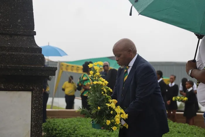 USIHLALO we-ANC, uMnuz Gwede Mantashe, ubeke izimbali elibeni lowayengumholi wokuqala we-ANC, uMnuz John Langalibalele Dube Isithombe: Facebook