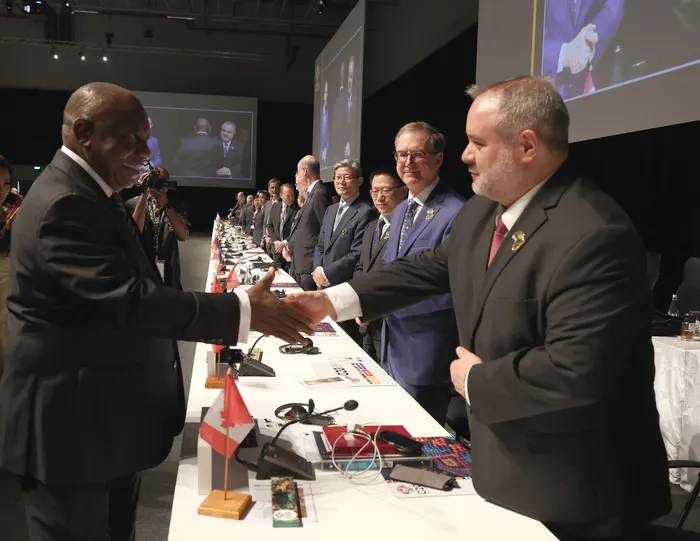UMENGAMELI Cyril Ramaphosa ebingelela izithunywa ngemva kwenkulumo yakhe yokuvula ngokusemthethweni umhlangano wokuqala woNgqongqoshe bezeziMali emazweni ayingxenye ye-G20 kanye nabaphathi bamabhange emibuso eKapa, izolo Isithombe: SITHUNYELWE