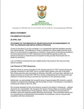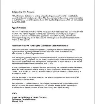 "INSFAS isebenzisana nezikhungo ukuqinisekisa ukuthi le nkinga ayiphindi yenzeke. Kunezitshudeni ezingazitholanga izimfanelo zazo, ngenxa yezinselelo kanti le nkinga iyalungiswa ukuze zithole imali yazo ngo-Ephreli 30," usho kanje.
