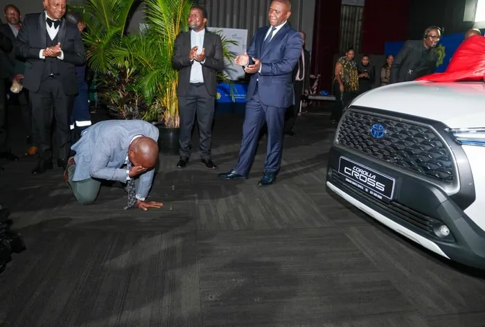Ukhale mi izinyembezi uSergeant Nhlanhla Patrick Mhlongo osebenzela esiteshini saseGreenwood Park, eThekwini, ethola isipho angasilindele emcimbini wokuklonyeliswa kwamaphoyisa enza kahle emsebenzini wawo.