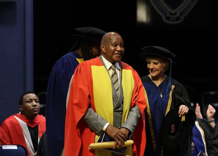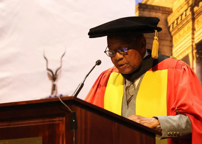 UMSUNGULI weKaizer Chiefs uDkt Kaizer Motaung ethula inkulumo emcimbini wokuthweswa iziqu weWits University, lapho ehlonishwe khona ngeziqu zobudokotela ngoLwesibili