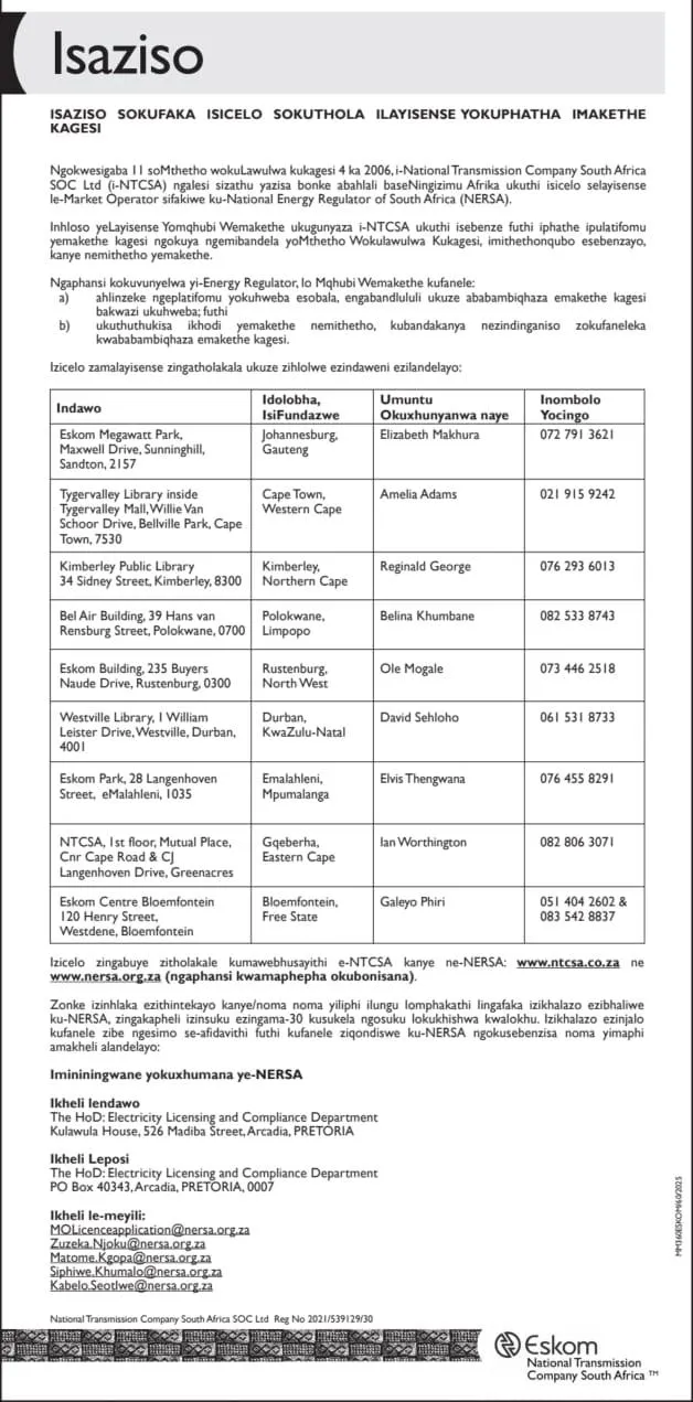INgokwesigaba 11 soMthetho wokuLawulwa kukagesi 4 ka 2006, i-National Transmission Company South AfricaSOC Ltd (i-NTCSA) ngalesi sizathu yazisa bonke abahlali baseNingizimu Afrika ukuthi isicelo selayisensele-Market Operator sifakiwe ku-National Energy Regulator of South Africa (NERSA).