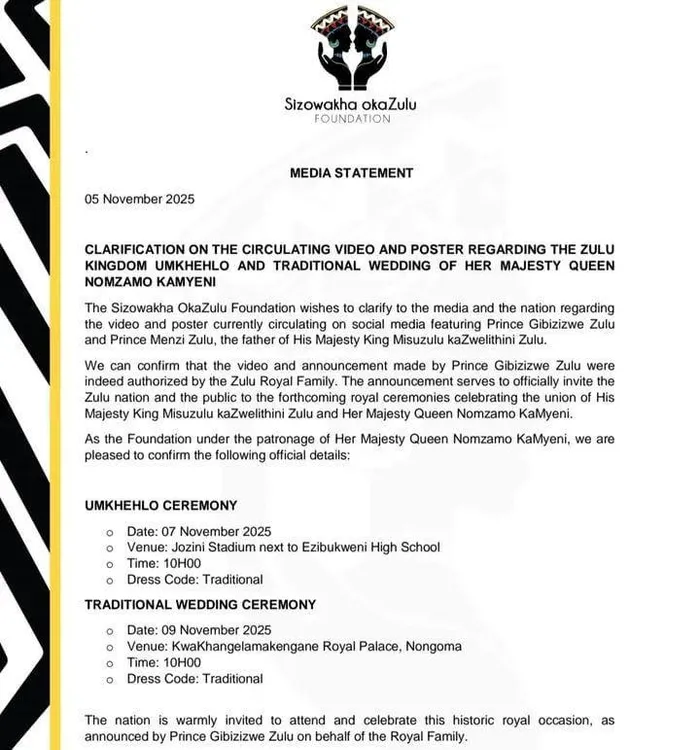 Ukusho lokhu esitatimendeni esikhishwe inhlangano yakhe engenzi nzuzo, iSizowakha okaZulu Foundation.