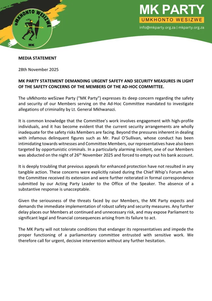 “Ngibhalela ukuze ngikwazise ngokusemthethweni udaba olukhathaza kakhulu mayelana nokuphepha nokuphepha kwamalungu eKomiti Le-Ad Hoc, ikakhulukazi lawo amele i-MK Party,” kubhala yena.
