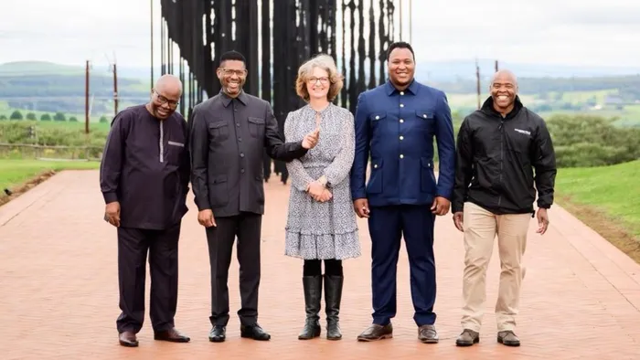 KUSUKELA kwesokunxele wuSihlalo weBhodi leKZN Tourism and Film Authority uDkt Sibusiso Ndebele, uMphathiswa woMnyango wokuThuthukiswa koMnotho, ezokuVakasha nokoNgiwa kweMvelo uMfu Musa Zondi, uSomlomo kaMasipala waseMngeni uNksz Jonis Holmes, isekela likaMasipala waseMngeni uMnuz Sandile Mnikathi neSikhulu esiPhezulu esiBambile seKZN Tourism and Film Authority uMnuz Sibusiso Gumbi beseNelson Mandela Capture Site, eMgungundlovu ngoLwesibili
