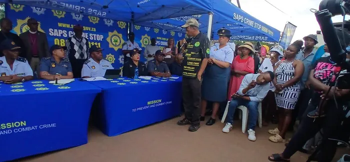 Umkhuzi wamaphoyisa kazwelonke General Fannie Masemola esithangamini nabezindaba esibanjelwe ngaphandle kwehhostela iSaulsville ePitoli