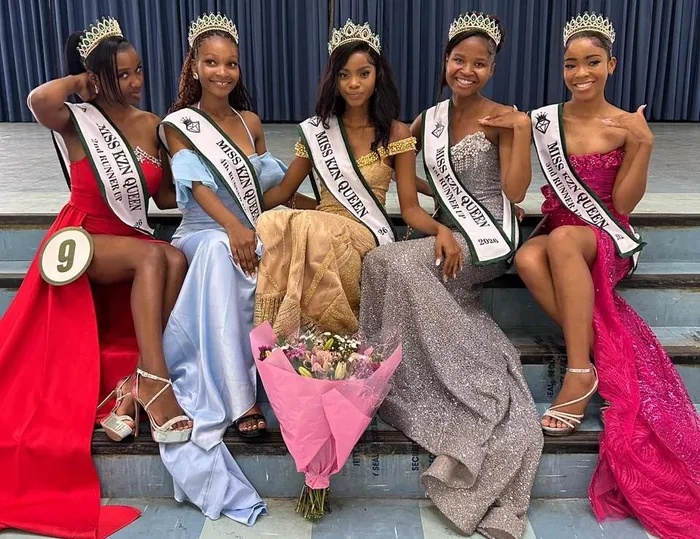 KUSUKELA kwesokunxele uThandeka Ngobese, Mendy Mbatha, Nokuzithemba Duma no-Akhona Cele bephahle uNelisa Khumalo odle isicoco sika-Miss KZN Queen 2025/26 obuse-Austerville Community Hall, eWentworth, eThekwini ngoMgqibelo