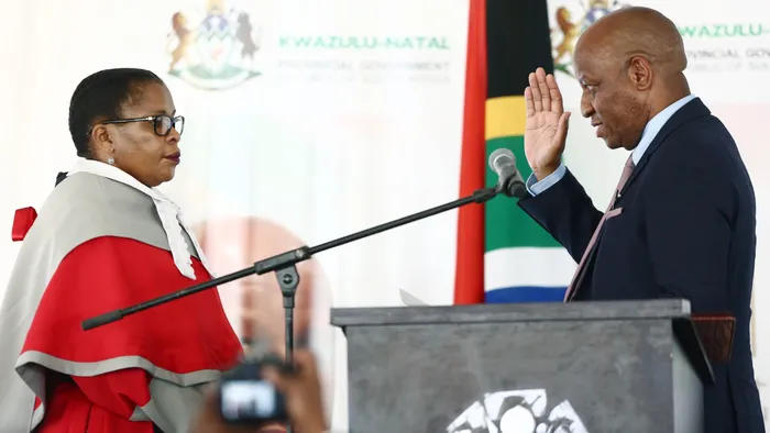 UNDUNANKULU waKwaZulu-Natal, uMnuz Thami Ntuli, owathathwa efungiswa ukuhola isifundazwe yiJaji uThoba Portia Poyo-Dlwati Isithombe: Sibonelo Ngcobo/ Independent Newspapers