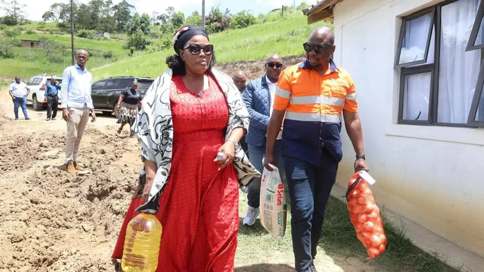 UMPHATHISWA wokuThuthukiswa koMphakathi, uNksz Mbali Shinga nosophikweni lwezokuxhumana kulo mnyango uMnuz Thuba Vilane bephethe okunye kokudla abakhalise ngakho komunye wemizi eshonelwe