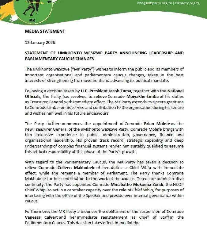 Seluphinde lwakhafula ulwandle eqenjini Umkhonto Wesizwe Party elikhiphe uMgcinimafa walo uMpiyakhe Limba lavala isikhala sakhe ngoMnuz Brian Molefe oyilungu lePhalamende laleli qembu.