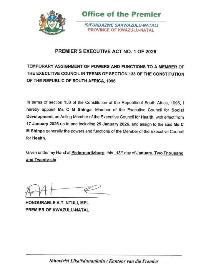 “Ngokwesigaba 138 soMthethosisekelo waseNingizimu Afrika, 1996, ngiqoka uNksz C M Shinga, iLungu lesigungu esiphezulu sezokuThuthukiswa koMphakathi, njengeLungu elibambile lomkhandlu ophethe wezeMpilo, kusukela mhla zingu17 Januwari 2026 kuze kube umhla ka-25 Januwari 2026, bese nginika le misebenzi eshiwo uNksz C M Shinga kanye nomkhandlu ophethe.