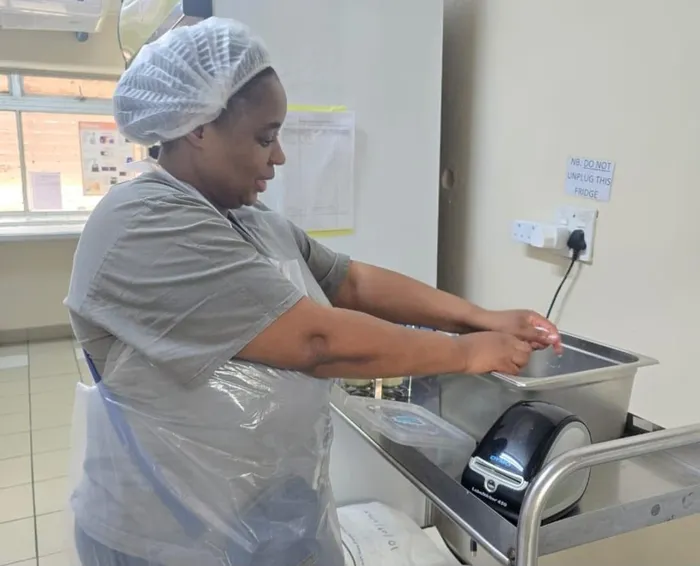 UNKSZ Phumzile Mabaso, owunesi esibhedlela iPrince Mshiyeni Memorial, osebenza ophikweni olwamukela ubisi lwebele olunikelwa kulesi sibhedlela ukusiza izingane ezizalwe kungakabi yisikhathi