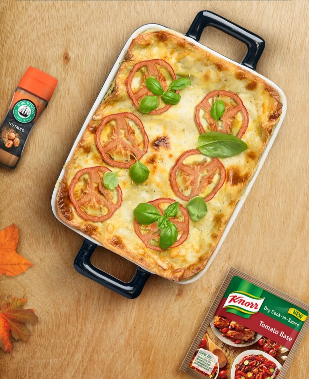 04 Manje enza i-white sauce. Ncibilikisa imajarini yama-vegan ebhodweni elincane bese ufake ufulawa ugovuza. Pheka isikhathi esiwumzuzu. Faka ubisi lwe-almondi, lonke ngesikhathi esisodwa, bese ugovuze kahle. Pheka emlilweni omaphakathi, ulokhu ugovuza, ize ishube i-sauce. Susa emlilweni bese unandisa nge-Robertsons Nutmeg, i-Robertsons Atlantic Sea Salt, ne-Robertsons Black Pepper.